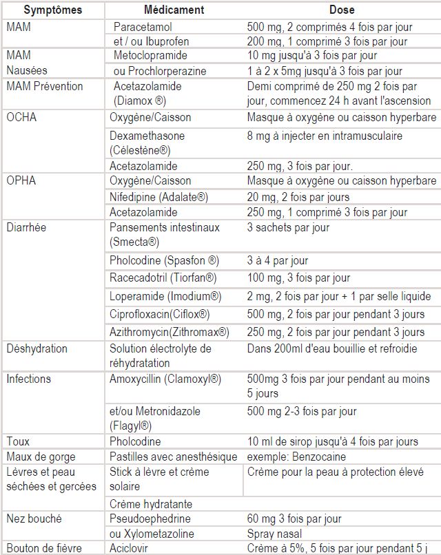 Aucun voyage en altitude ne devrait être organisé sans un minimum de médicaments. Certains sont soumis à prescription et ne devraient pas être pris sans avis médical. Certains pourront sauver votre vie alors que d’autres ne traiteront que des symptômes et amélioreront votre confort.